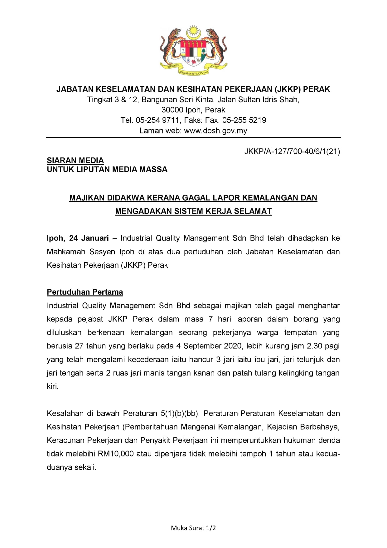 Department Of Occupational Safety And Health On Twitter Siaran Media Majikan Didakwa Kerana Gagal Lapor Kemalangan Dan Mengadakan Sistem Kerja Selamat Jkkp Dosh Staysafe Stayhealthy Https T Co Wrmm8mohub Twitter